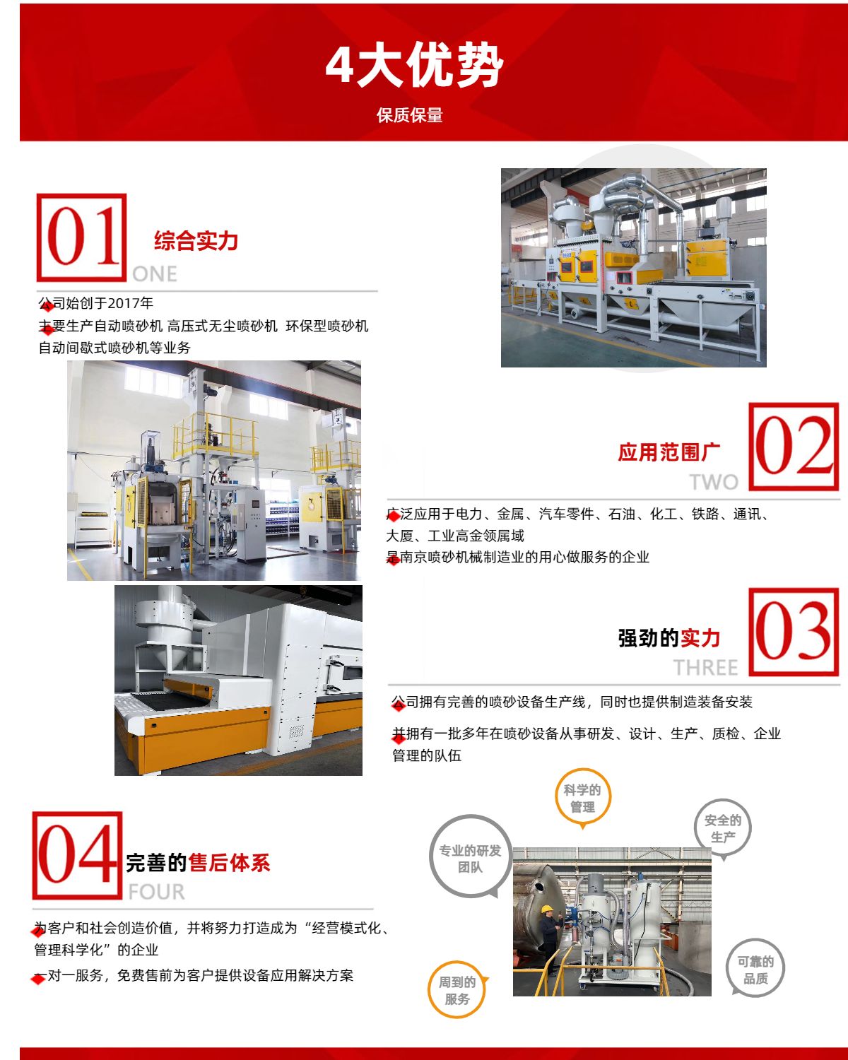 南京華制機械制造有限公司是一家以表面處理機械工程為主的高科技民營企業(yè),公司總部位于福建廈門(黔豐機械)。公司自創(chuàng)立以來一直致力于表面處理工程;始終堅持發(fā)揚誠信、創(chuàng)新、溝通為企業(yè)宗旨,以技術(shù)、服務(wù)為立業(yè)之本的團(tuán)體精神,并形成一套完整的設(shè)計、研發(fā)、生產(chǎn)、安裝、調(diào)試、培訓(xùn)、維護(hù)與一體的服務(wù)體系。其服務(wù)內(nèi)容包括:自動化噴砂系統(tǒng)、自動化拋丸系統(tǒng)、大型工件噴砂房系統(tǒng)、無塵打磨系統(tǒng)、貴州品牌磨料直銷、噴砂加工、噴鋅、機械配件、設(shè)備外包維護(hù)、升級、改造等,同時公司為所有承建項目建立維護(hù)檔案,設(shè)立專門的維護(hù)部門,推行快速響應(yīng)機制,確保在及時解決客戶后續(xù)之憂。公司與國內(nèi)外眾多合作企業(yè)建立了良好、穩(wěn)固的合作伙伴關(guān)系,公司逐步形成強大的人才、技術(shù)和品牌優(yōu)勢。并先后為:新凱復(fù)材、宸鴻光電、三星、歐瑞康(中國)、廈門太古飛機、正新輪胎,旺旺集團(tuán)等眾多企業(yè)的緊密合作伙伴。公司擁有一支朝氣蓬勃的技術(shù)團(tuán)隊,現(xiàn)有10余名工...